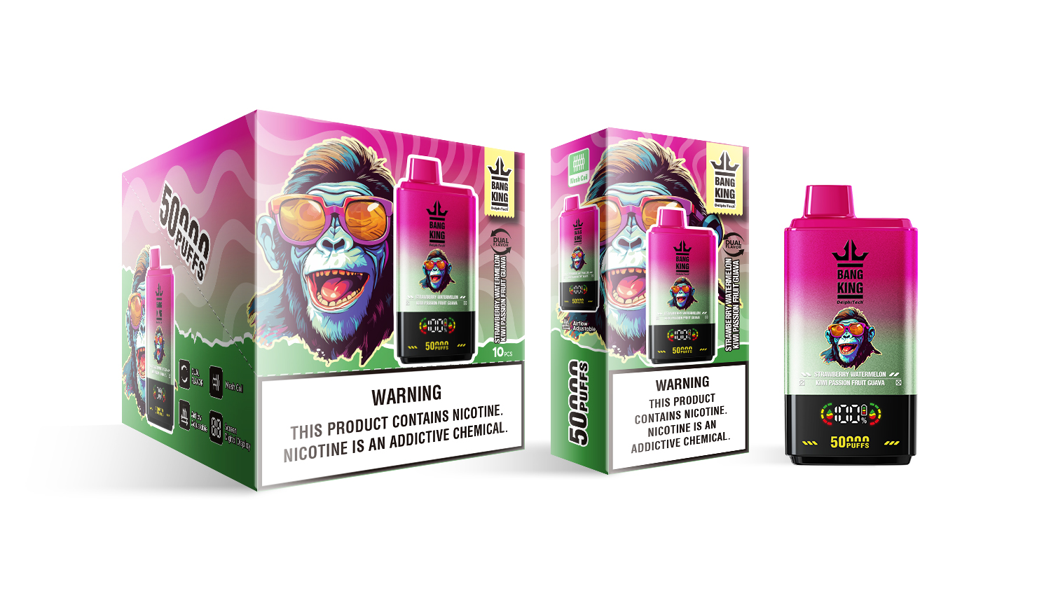 Das stilvolle, kompakte Design der Bang King 50000 vereint Eleganz mit Portabilität. Die beiden Geschmacksrichtungen – klassisch-erfrischende Erdbeer-Wassermelone und die exotische Dreifach-Kombination aus Kiwi, Passionsfrucht und Guave – bieten maximale Vielfalt und machen jede Dampfsession zu einem besonderen Erlebnis.